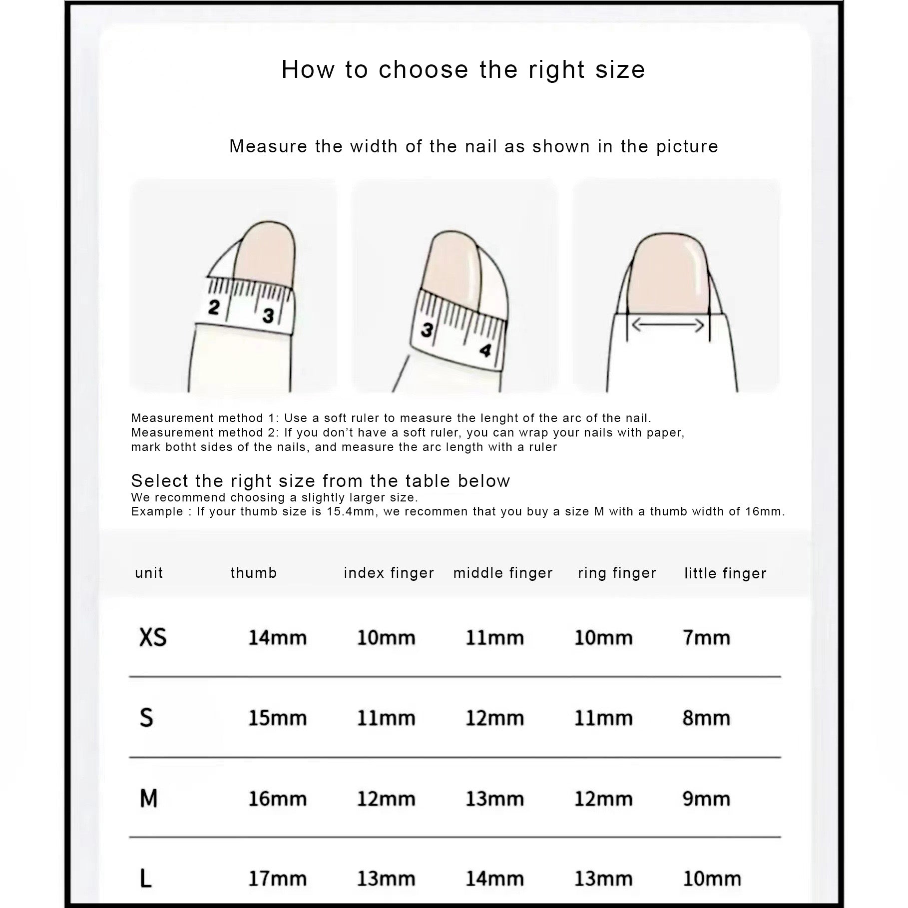 Size Selection: Please refer to the size chart in the product details to match your nail size. Choose a size that matches the width of the nails. If you are between two sizes, it is recommended to choose a slightly larger size for a comfortable fit